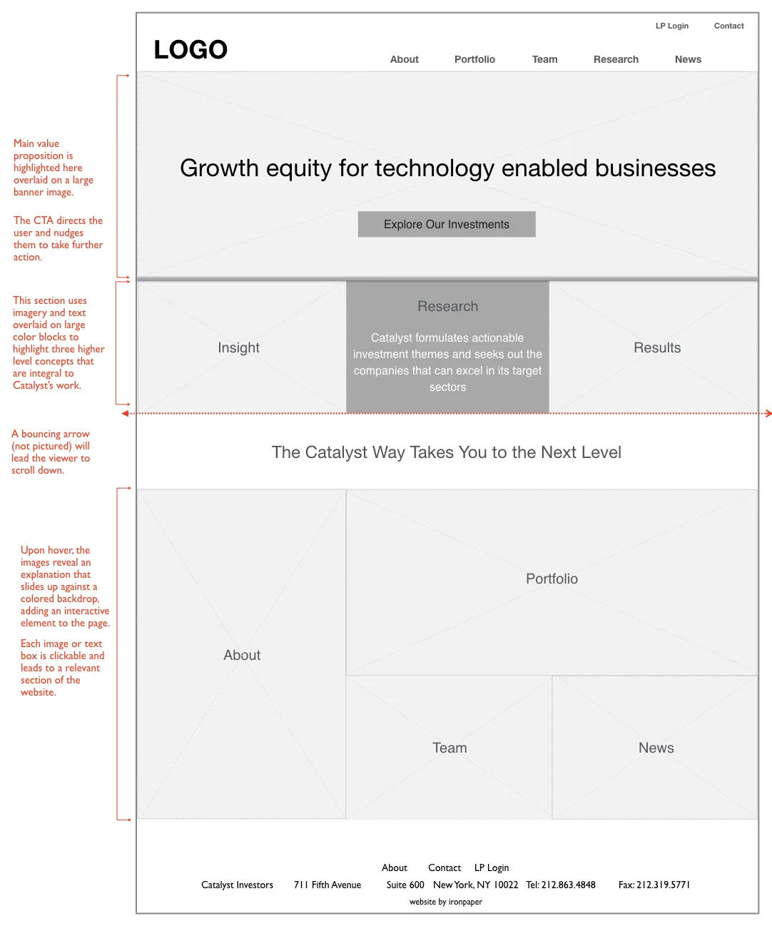 In our new design, we used large, attractive images to increase visual appeal and evoke a feeling of affluence appropriate to the financial sector. We also added interactive elements in order to create a sense of technological savvy, reflecting the client’s focus on investing in high-tech companies, and added a call-to-action button to the hero image section to direct users to the company’s portfolio page.