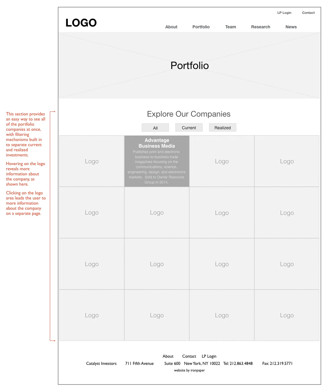 I decided to present all of the companies using large, interactive panels featuring a logo and a brief summary of the company upon hover. The panels are also clickable and lead to the featured company’s homepage.